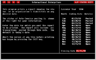| Closing Date | Enter the closing date for the report and press [RETURN]. In many cases this will be the cutoff date for a fiscal period. However, the report can be printed for any date desired. |