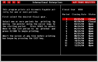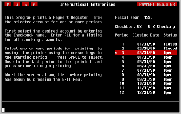 | Fiscal Year | Unlike many accounting systems, the Payment Register can be printed as many times as desired and can even be printed for prior fiscal years. Using the conventions discussed at the beginning of this manual, select the fiscal year for which the report is to be printed. The default is the current year. Press [RETURN] to proceed to the next field. |