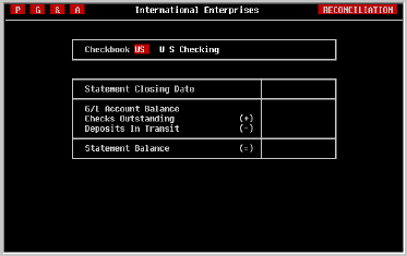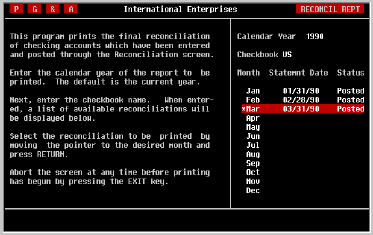 | Calendar Year | Using the conventions discussed at the beginning of this manual, select the calendar year from which the reconciliation will be chosen. The default is the current year. Press [RETURN] to proceed to the next field. | ||||||||||