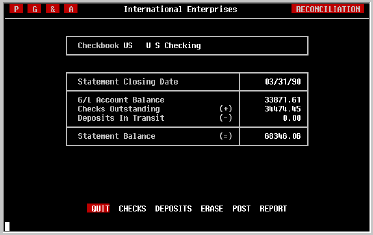 date provided by your bank on the statement. When the date has been entered, the program will load the data you will need to proceed with the reconciliation, such as outstanding checks and deposits for the month. This information will be then displayed as shown in the example below.