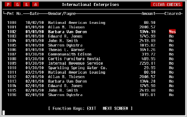 Notice as you do this that the column becomes blank. This is merely a device to make it easier to identify the checks which have or have not been cleared on the screen. Blank means 'Yes' as you will see if you use the cursor [UP] key to move the cursor up to a check you have cleared.