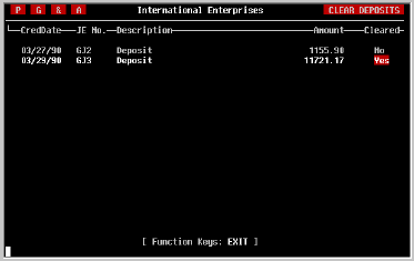 The purpose of this screen is to identify any deposits, or other credits, which have been posted to the general ledger, but do not appear on the bank statement. Under normal circumstances, most of these transactions will be reflected in your bank statement. As a result, each transaction shown on the screen has been 'Cleared' for you. Beginning at the end of the list, which may be longer than will fit on a single screen, confirm that each deposit or credit shown is also shown in the bank statement. For each transaction which does not appear on the bank statement, indicate this on the screen by entering a [N] next to the transactions. During this process, you can use the cursor [UP] to move the cursor to a previous transaction and the cursor [DOWN] and [RETURN] keys to move the cursor down to the next one. In addition, you can use the NEXT SCREEN or PREV SCREEN keys to page forward and backward through the list. When finished, press the EXIT key to return to the Reconciliation screen where the amount of Deposits in Transit will be changed to reflect the deposits or credits you have indicated did not appear on the statement. You can exit and re-enter the Clear Deposits screen as many times as is necessary until the statement reconciles and you have posted it. | ||||||||||