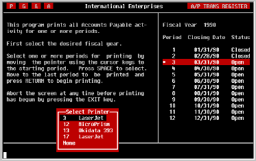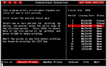 | Default | As you can see, there are several choices. If a default printer was defined in the Accounts Payable Parameters screen, the first option will be Default Printer and the second will be Another Printer. To select the default printer, press [RETURN] because this option was already highlighted when the menu appeared. |