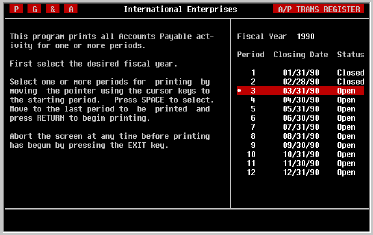 | Period | Select the period to be printed by moving the highlight bar to the period and pressing the [SPACE] key. An asterisk (*) will appear indicating that the period has been selected. If multiple consecutive periods are desired, use the cursor [DOWN] key to select the next period, and the cursor [UP] key to deselect the last period. Press [RETURN] when completed. |