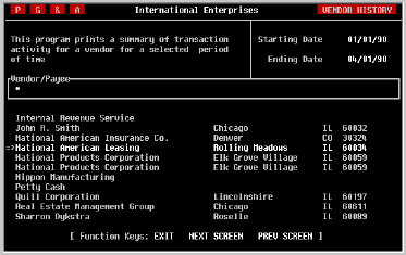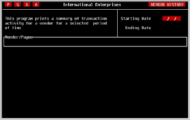 | Starting Date | Using the conventions discussed at the beginning of this manual, enter the date for which you would like data pertinent to the vendor to begin. Press [RETURN] to proceed to the next field. |