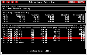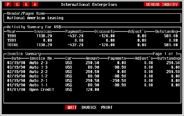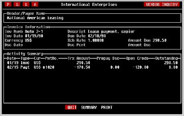 year and grand total. If you are using the system's multi-currency capabilities it will be helpful to understand that this summary is by currency. If you have accepted invoices from the vendor in more than one currency, only one can be shown here at a time. Use the 'CURRENCY' option in the one-line menu at the bottom of the screen to change the currency being displayed. |