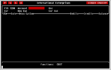 | From the TK-ACCOUNTING menu, select General Ledger. From the GENERAL LEDGER menu, select Account Inquiry. Immediately after selecting the Account Inquiry option, the following screen will be displayed.