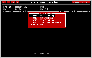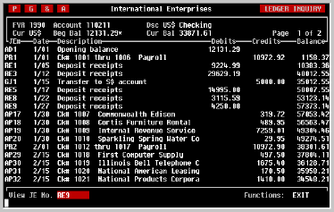 very easy to go back and review transactions entered in the past. When the screen is first displayed, the current fiscal year will be displayed in the fiscal year field and the cursor will proceed directly to account selection. If you want to review transactions from a prior fiscal year, use the cursor [LEFT] key to get to the fiscal year field. Select the desired fiscal year by entering the year (with century). You can also press the [+] or [-] keys to increment or decrement the fiscal year by one, respectively. When you have selected the desired year and pressed [RETURN] the cursor will move back to the 'Account' field. | |||||||||||||||||||||||||||||||||||