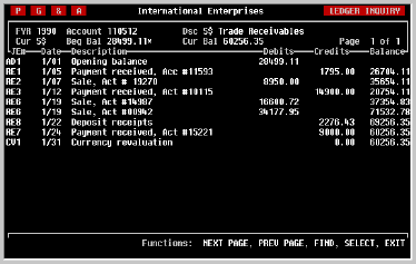 Notice that the Beginning Balance of the account is flagged with an asterisk (*), and that the first transaction (JE# AD1) shows no affect on the account balance. Actually it did affect the balance, but only the Balance Brought Forward or the 'Beg Bal' as shown. Also note that the transaction is clearly shown to have been posted to the Balance Sheet Adjustment journal; the journal entry number is 'AD1' indicating the journal ('AD') and the first entry posted to that journal in fiscal 1990.