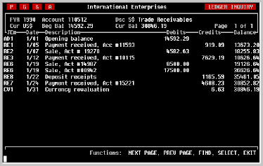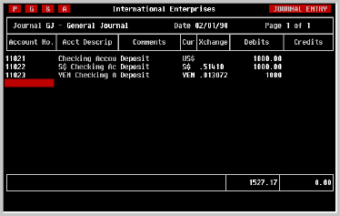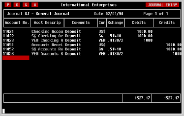 The base currency equivalents of these transactions can be viewed quickly by pressing the [SPACE] bar. The screen will be changed to display base currency, as illustrated below, and will remain in base currency until the [SPACE] bar is pressed again.
