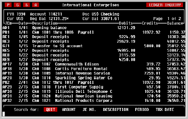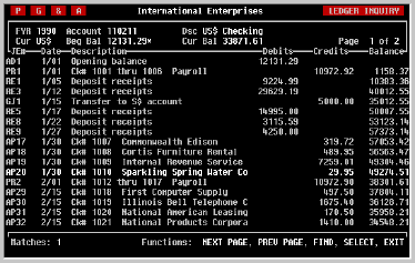 Knowing how many matches there are doesn't help find them, particularly in a heavily used account. For this situation, TK-LEDGER assigns a special function to the cursor [UP] and cursor [DOWN] keys. While the NEXT PAGE and PREV PAGE keys still enable you to page sequentially up and down the account, the cursor [DOWN] key will display the next page which contains a match and the cursor [UP] key will display any previous page which contains a match. In this way, the transaction or transactions to be reviewed can be quickly located.