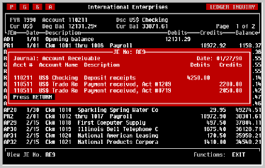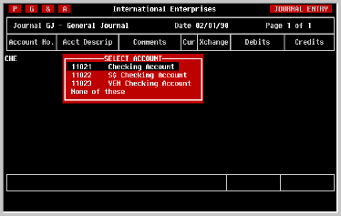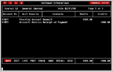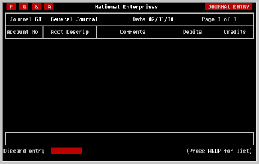 and select the 'QUIT' option or simply press EXIT. Should it be necessary to exit the Journal Entry screen before completing an Entry, don't worry about losing what you have entered. The Entry will still be there in your work space when you return to the screen later.
