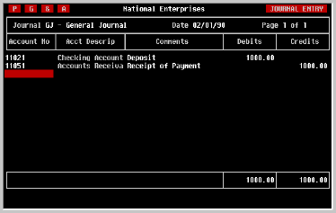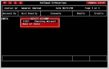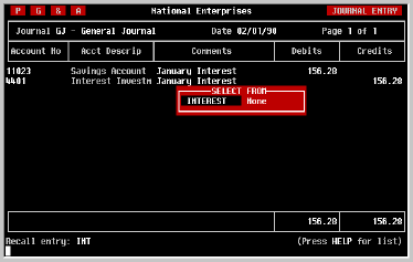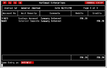 Enter a name for the entry which you will be able to remember later, such as 'INTEREST' for a monthly Interest Entry, and press [RETURN]. The Journal Entry you have entered is now saved and can quickly be recalled using the name you provided it. | ||||||||||||||||||||||||||||||||