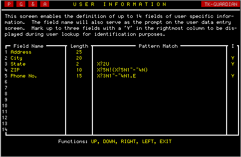 The user information screen provides the ability to define the contents of your system's user database. Each field defined on this screen will become part of the user data entry screen discussed later.