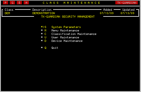 Select System Parameters from the TK-GUARDIAN Security Maintenance Menu.