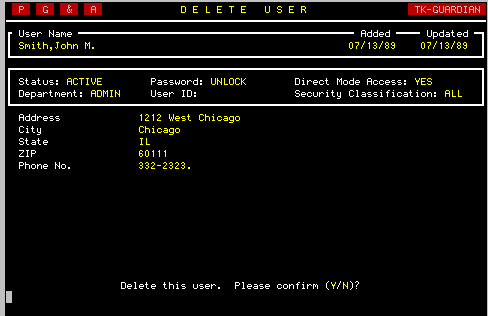As you can see in the example above, the user's data is displayed to assist in confirming that the correct user has been selected. If this is not the intended user, press N or the EXIT key to search again. Otherwise, press Y. The user will quickly be removed.