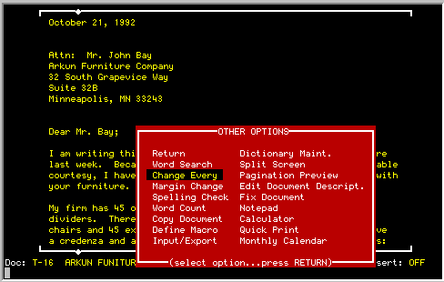 Once the CHANGE EVERY command has been selected, enter the word or phrase to be replaced and press <RETURN>. Then enter the word or phrase to replace with and press <RETURN>. If the cursor is not at the beginning of the document, you will be asked whether the search and replace operation is to start at the current cursor position or at the beginning of the document. Enter <H> for HERE or <B> for BEGINNING. To halt the CHANGE EVERY operation press any alphanumeric key.