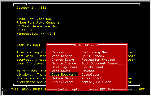 You will then be reminded that this copied text can be inserted with the INSERT TEXT command of the same <COPY/MOVE/INSERT> function key. Press "RETURN" to return to the edit mode. See INSERT TEXT for information concerning inserting the text in the current document or in another document. Entire documents can be copied with the Copy Document option from the Special Options menu as illustrated below: