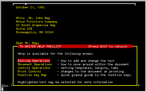 The help screens provide context sensitive documentation concerning the various aspects of TK-WRITER. This means that the help screen will be different depending upon where you call it up. From the initial screen, you may then call upon other screens to obtain more information. Once the help screen is displayed, you may perform the following operations: