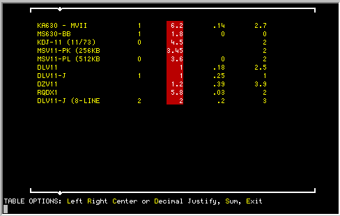 Use the <NEXT SCREEN> and <PREVIOUS SCREEN> functions keys to move the highlighted column marker from column to column. This marker indicates on which column the table commands will operate (it only works on one column at a time). Notice that the marked columns are marked with a column width that encompasses the left-most-edge and the right-most-edge of the column. This is the column width and these boundaries are used in the following options: