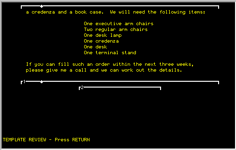 SELECT function key, and <T><C> for Template (Create) , or <1> through <9> to select a template, or <R> to review current templates <RETURN> to select template defined for current cursor position | |||||||||||||||||||||||||||||||||||||