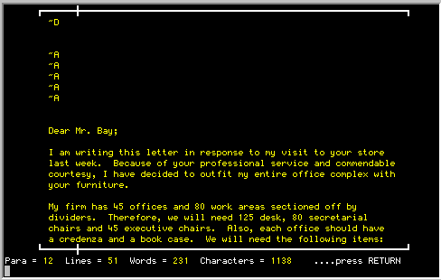 With the INSERT MODE ON any character at the cursor position as well as all of characters to right of the cursor will be moved to the right as you type. If the line becomes full, one word at a time will be removed and will fall to the next line. The <RETURN> key behaves differently when the INSERT MODE is ON. Each time you press the <RETURN> key the current line will be split at the present cursor position and the remainder of the line will be repositioned on the next line (as in CUT LINE). The cursor will jump down to the beginning of the next line. Pressing <RETURN> on blank lines will insert a blank line. | |||||||||||||||||||||||||||||||||||||