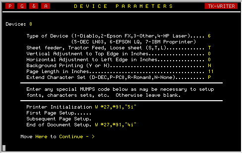 Although TK-WRITER will generally issue all of the initialization that is needed for any given printer type, you may add your own initialization code as a supplement. Note that you may either enter decimal values of the escape sequences (using the comma as a delimiter) or MUMPS code. Other Printer Feature definition