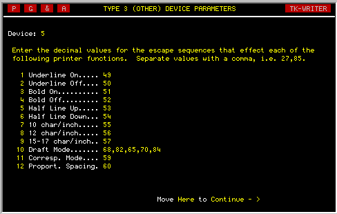 If you selected printer type 3, then you will need to instruct TK-WRITER in what it takes to invoke bolding, underlining and other features that may be used during the printing process.