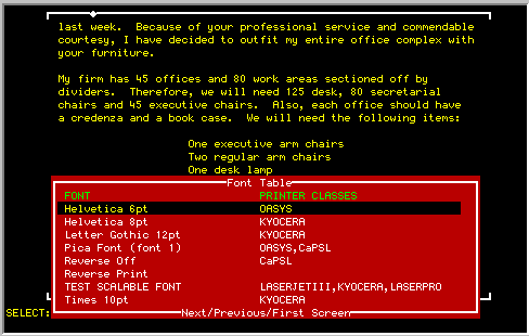 | If your printer supports multiple typing fonts or other special printer features, references to these printer features can be made at any point within the document. See SELECT FONTS in Section 3 for a description of how to insert these references into your document. See the SYSTEM MANAGER'S MENU for information on how to add and edit the entries in the font selection file.