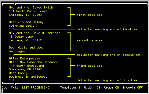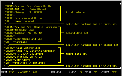 Notice the blank lines in the first and second data sets. They are place holders and are important. To understand how these lines are merged into the document, let us first look at the sample document on the next page.