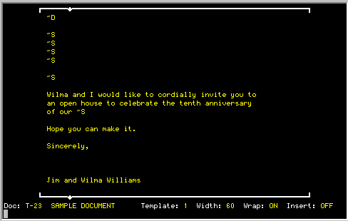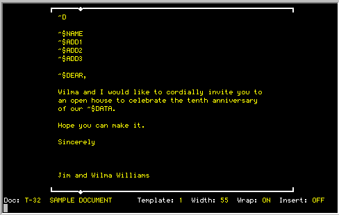 You will notice that there are six ~ S stops in the document. TK-WRITER loads each of these "stops" with one line from the data set until the data is exhausted. Any remaining "stops" will be left blank. In the last screen, "Mr. and Mrs. James Smith" would replace the first ~ S, "101 North Main Street" would replace the second and so on. If the data line is blank and the "stop" is the only thing on the line in the document, then the line will be ommitted when printed and the remaining lines will be moved up one line. This prevents blank lines in the printed document when the data set varies in length. Remember that you must still leave the blank line in the data set so that order is maintained. You may also include glossary text in the data set which will then be merged with the document when it is printed. Glossary text is similiar to the "stops" except that it is not inserted in the document in any particular order, but rather it is inserted where the corresponding glossary reference is made in the document. The example illustrated on the next page provides similiar results as the previous example but uses glossary text rather than "stops".