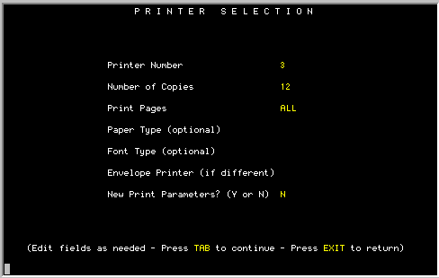 | The print queue is controlled through the use of the Print Document options. You may add a document to the queue (list), remove a document, or monitor the status of the print queue. Each document in the queue will be printed in the order that they are entered. Each printer has its own queue. Use the Monitor Print Queue option to get a listing of the documents that are queued up to print. They are listed in order of priority by printer. The documents will be listed as being in one of the following states-