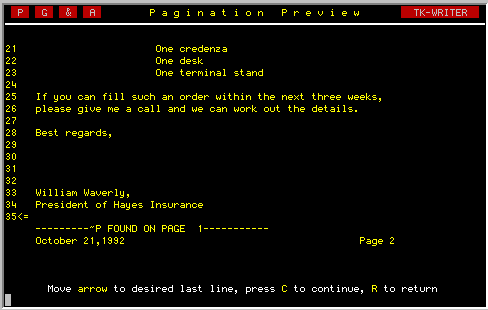 | Automatic pagination is performed by the Word Processor if you select the bottom margin on option #10 of the Print Parameters Option table. The document will be broken to allow for the specified bottom margin and the text will continue on the next page. Orphan and Widow line processing will be conducted so that the document will not have a single line at the bottom or top of the document that belongs to the paragraph on the preceding or succeeding page. If you want to control your own pagination or break a page before it would automatically, then you must type a ~ P in the text where you want a new page to start. When you want to preview the page breaks before you actually print the document, use the Pagination Preview option under the Special Options menu.