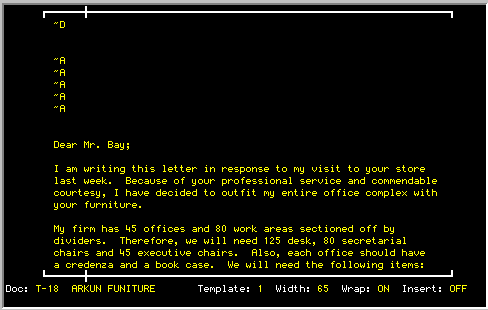| Often it is desirable to change certain portions of a document each time it is printed, while other portions remain unchanged. A form letter in which the name and address change each time it is printed is a good example. The changing (or variable) portion of the document may be entered at the time of printing using the Variable Data Entry screen. In order to prepare a document for variable data, it is necessary to insert ~ S at each place in the document where changes will need to be made. When adding these stops to the document, it is possible to enter text to the immediate right of the stop, and edit the entry again at the time of printing. When the document is queued to print, you will be asked to enter any variable data that is required. The Variable Data Entry screen will display each of the stops and leave room for you to add or edit the text to the right of them. Each new section of stops will be indicated by a "*" in the left margin. The variable data entered will be stored in the print queue along with the document and will then be combined with the document when it is printed. Use the ~ A control character to include the variable data on the envelope using the envelope option. VERTICAL SPACING