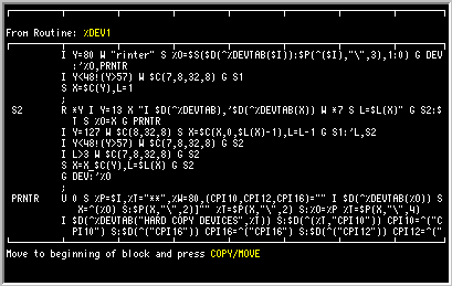 Proceed to Step 2. Press the COPY/MOVE function key and type [C] or select COPY from the COPY/MOVE menu. You will be asked for the name of the routine from which the text should be copied. If you are copying from the current routine, press the return to accept the default. If you wish to copy from another routine, enter the name of the routine and press [RETURN]. You may use the "?" wildcard to search the routine index if you are unsure of the name. When you have entered the name of the routine, you will be given a menu of the locations in which the routine can be found. This list can include WORKFILE, ARCHIVE, and MUMPS. Select the desired source and press [RETURN]. The routine will be displayed to enable you to find and select the text to be copied, as illustrated below.