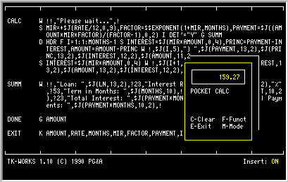 When the calculator has been displayed, you can use it like you would any pocket calculator. Enter a number, an operator, a number and an equal sign for a simple calculation, or chain calculations together using the equal sign at the end. A list of operators and their key assignments is included below.