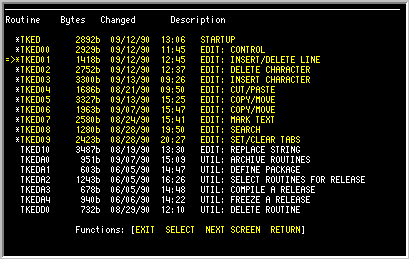 The simplest way to select a routine is to enter the routines name and press [RETURN]. Conversely, to deselect a routine, enter a hyphen "-" followed by the name of the routine to be deselected. As additions and subtractions are made, the updated list will be displayed as shown in the next illustration. Notice that the number of routines selected and the total of the routine sizes is shown on the top row of the screen. In addition, the size, date last modified and description of each of the selected routines are shown to the right of each routine name. If the number of selected routines exceeds the available space on the screen, the NEXT SCREEN and PREV SCREEN keys can be used to page forward and back through the list for examination. Complete the selection process by pressing [RETURN] at an empty 'routine: ' prompt, or abort the process at any time by pressing the EXIT key.