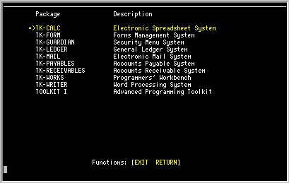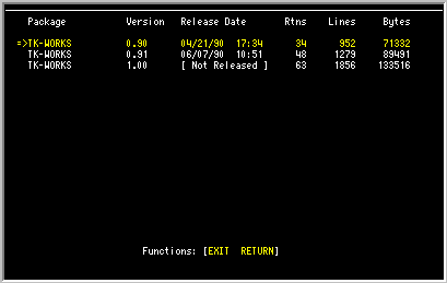 To select a package from the list, move the pointer to the desired item and press [RETURN]. If you do not find the package, press EXIT to look again. If the package has not yet been defined to the system, be sure to enter the full package name and press [RETURN]. You will be asked to confirm addition of this package. Answer by typing a [Y] to add, or [N] to look again, and press [RETURN].