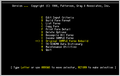 After making a number of changes to the SAMPLE forms, you may decide to return to the original forms we gave you. Should this happen, invoke the TK-FORM editor and select the following option: