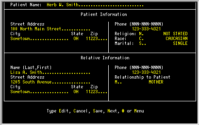 The sample screen is a registration form for a patient. The shaded areas are the data fields and you can see that some data has already been entered.Fig. 1 TK-FORM SAMPLE SCREEN 2