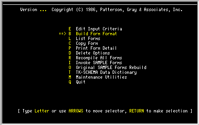 Choose the menu item, "B Build a Form Format", and press RETURN. Another screen with the prompt, "Enter the Form Series", will appear. Up to ten alphanumeric characters may be entered to describe a form series.