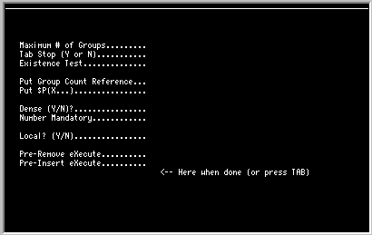 1. D ^TKFORMETo edit the group, position the cursor at the top row and left column coordinate specified in the group, and press Control F. This is the same process as editing a normal field. If you do not remember these coordinates, move the cursor to any blank spot on the screen. Press Control F and enter the group identifier. TK-FORM will move the cursor to the top left coordinate and allow you to edit the group.2. Delect the Build Screen option and create a screen.